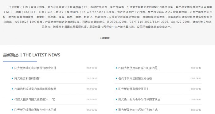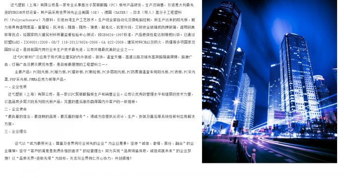 迂弋塑膠(上海)有限公司是一家專業(yè)從事高分子聚碳酸酯(PC)板材產(chǎn)品研發(fā)、生產(chǎn)及銷售,引進(jìn)意大利最先進(jìn)的UNION共擠設(shè)備,其產(chǎn)品采用世界領(lǐng)先企業(yè)美國(GE)、德國(BAYER)、日本(帝人)高分子工程塑料PC(Polycarbonate)為原料,引進(jìn)臺灣生產(chǎn)工藝技術(shù)。生產(chǎn)線全部自動化及微電腦控制,所生產(chǎn)出來的陽光板、耐力板具有透明度高、重量輕、抗沖擊、隔音、隔熱、難燃、耐老化、抗紫外線,又稱安全玻璃或防彈玻璃,透明鋼美稱等優(yōu)點(diǎn),經(jīng)國家防火建筑材料質(zhì)量監(jiān)督檢驗中心測試,按GB8624-1997標(biāo)準(zhǔn),產(chǎn)品燃燒性能達(dá)到難燃B1級。已通過歐盟RoHS、ISO9001:2008、GB/T 116-2012/8624-2006、GA 422-2008、建筑材料CNAS及防火、防爆等多項國家及國際認(rèn)證。是目前國內(nèi)同行業(yè)中生產(chǎn)技術(shù)最先進(jìn)、公司環(huán)境最優(yōu)美的企業(yè)之一。