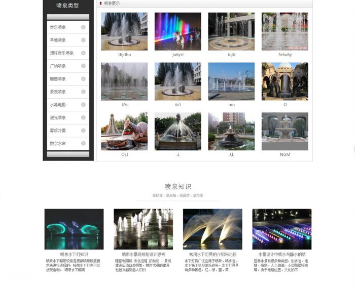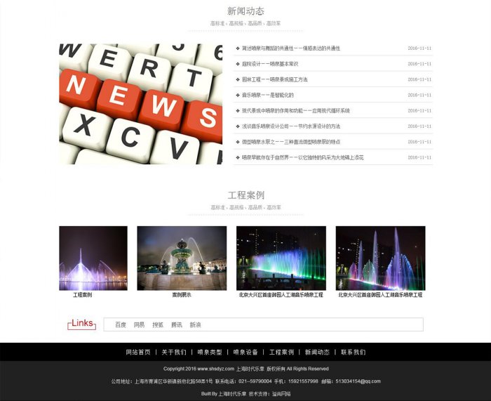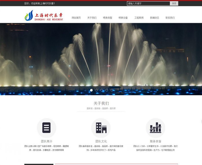 網(wǎng)站描述:首頁采用企業(yè)型網(wǎng)站排版方式,以簡潔化排版方式,突顯公司實(shí)力,以實(shí)際案例展示,表明公司業(yè)務(wù)范圍。首頁包含版塊有關(guān)于我們版塊,產(chǎn)品中心版塊,噴泉知識(shí)版塊,噴泉設(shè)備版塊,新聞動(dòng)態(tài)版塊,工程案例版塊。