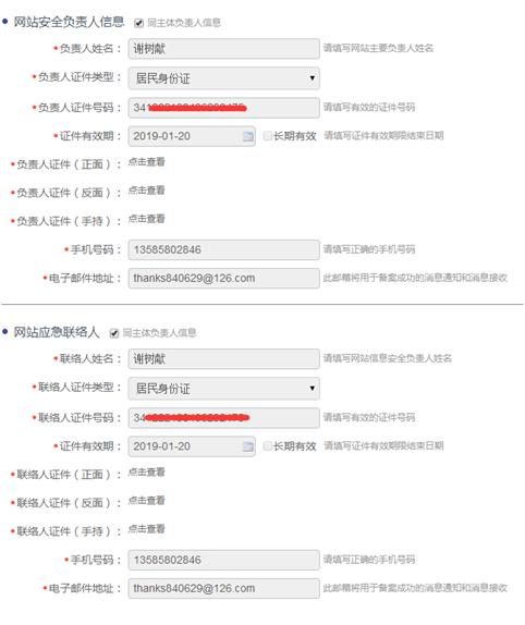 這個可以直接選擇 “同主體負責人信息”或者另外填寫,都可以。
