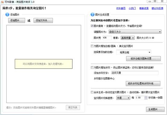 5.批量處理軟件頁面右邊是為左側(cè)列表中的圖片設(shè)置,分別有圖片瘦身、美化圖片、增加水印、合并圖片四個功能。*特別提示:處理水印圖片最好是另存為,這樣有所改動的圖片可重新處理。