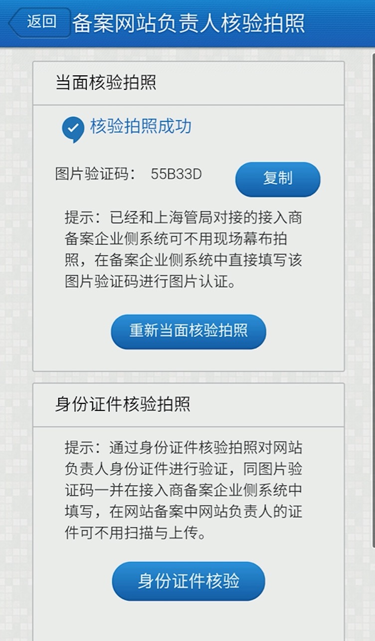 重新驗(yàn)證:如果您的核驗(yàn)拍照環(huán)境光線不清楚時(shí),可以選擇重新驗(yàn)證。點(diǎn)擊會(huì)重新進(jìn)入備案網(wǎng)站手機(jī)當(dāng)面核驗(yàn)拍照,驗(yàn)證成功將替換上次手機(jī)核驗(yàn)拍照?qǐng)D片。